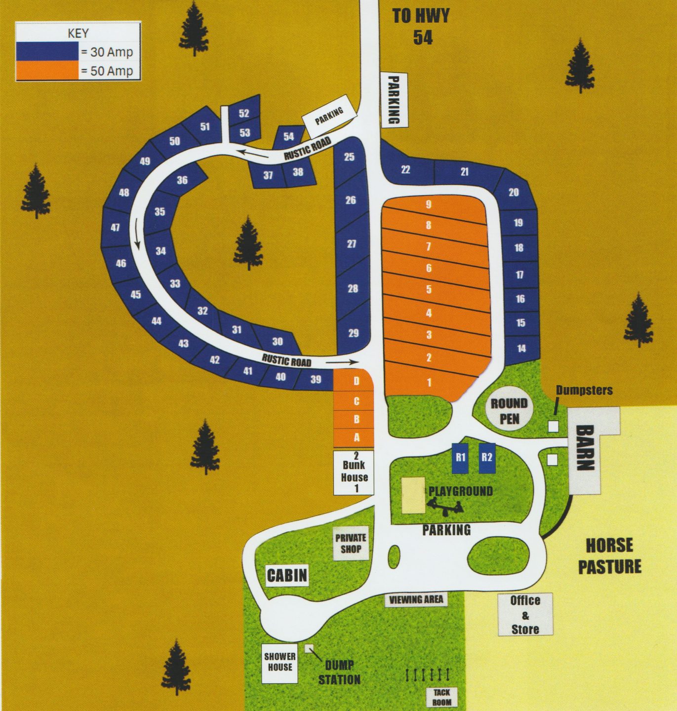 Check out our campground map to find a site best for you! We have 54 campsites, all with water and 30 amp electric and some with sewer too. Our extra large camping sites are nestled in our beautiful oak forest which offers plenty of shade and privacy. Sites A, B, C, and D on the campground map have 50 amp service.